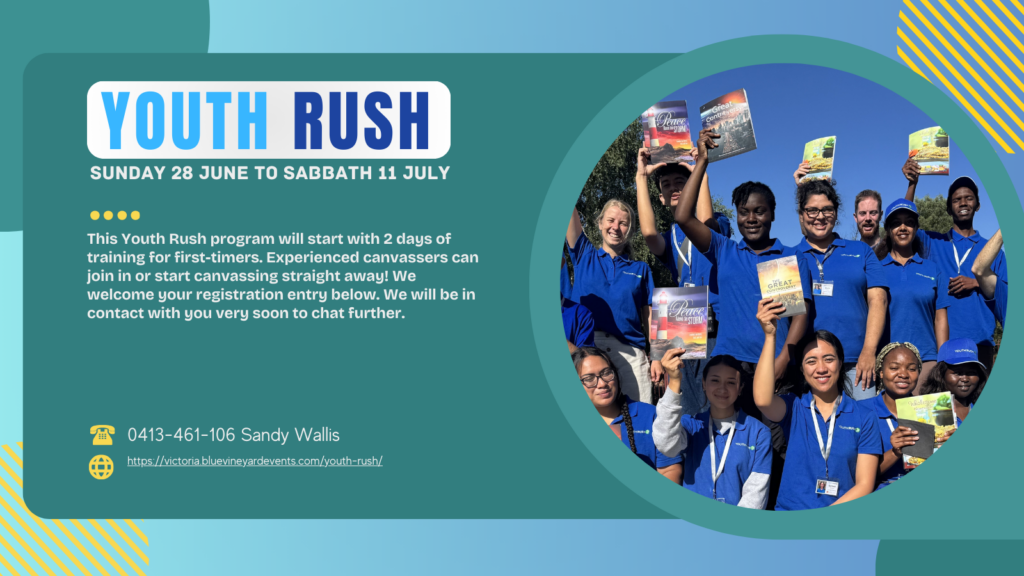 While at the YOUTH RUSH Conference, I understand that photos and videos of those covered by this registration may be taken and that this event could be live-streamed. I also understand that the photos and video footage may subsequently be used in productions and promotions (including print, internet, social media and audio-visual presentations) by Literature Ministries and the Victorian Conference.